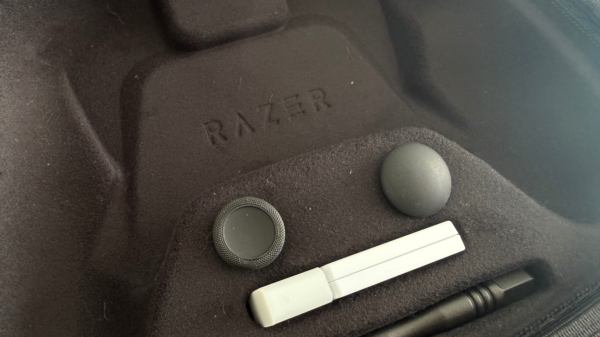 Au déballage, Razer ne s’encombre pas du superflu et va droit au but. La manette est livrée dans une pochette rigide de transport, un ajout apprécié si vous êtes un habitué des LAN — ce qui n’est pas mon cas malheureusement, mais l’attention reste très appréciable. À l’intérieur, on découvre également le dongle sans fil indispensable pour assurer une connexion sans latence, ainsi qu’un petit tournevis, un accessoire intrigant qui sert finalement juste à retirer les palettes à l’arrière. Enfin, pour ce qui est de la recharge de la batterie ou si vous préférez opter pour une connexion filaire (afin de minimiser au maximum la latence), sachez que la manette est logiquement fournie avec un câble USB-A vers USB-C.