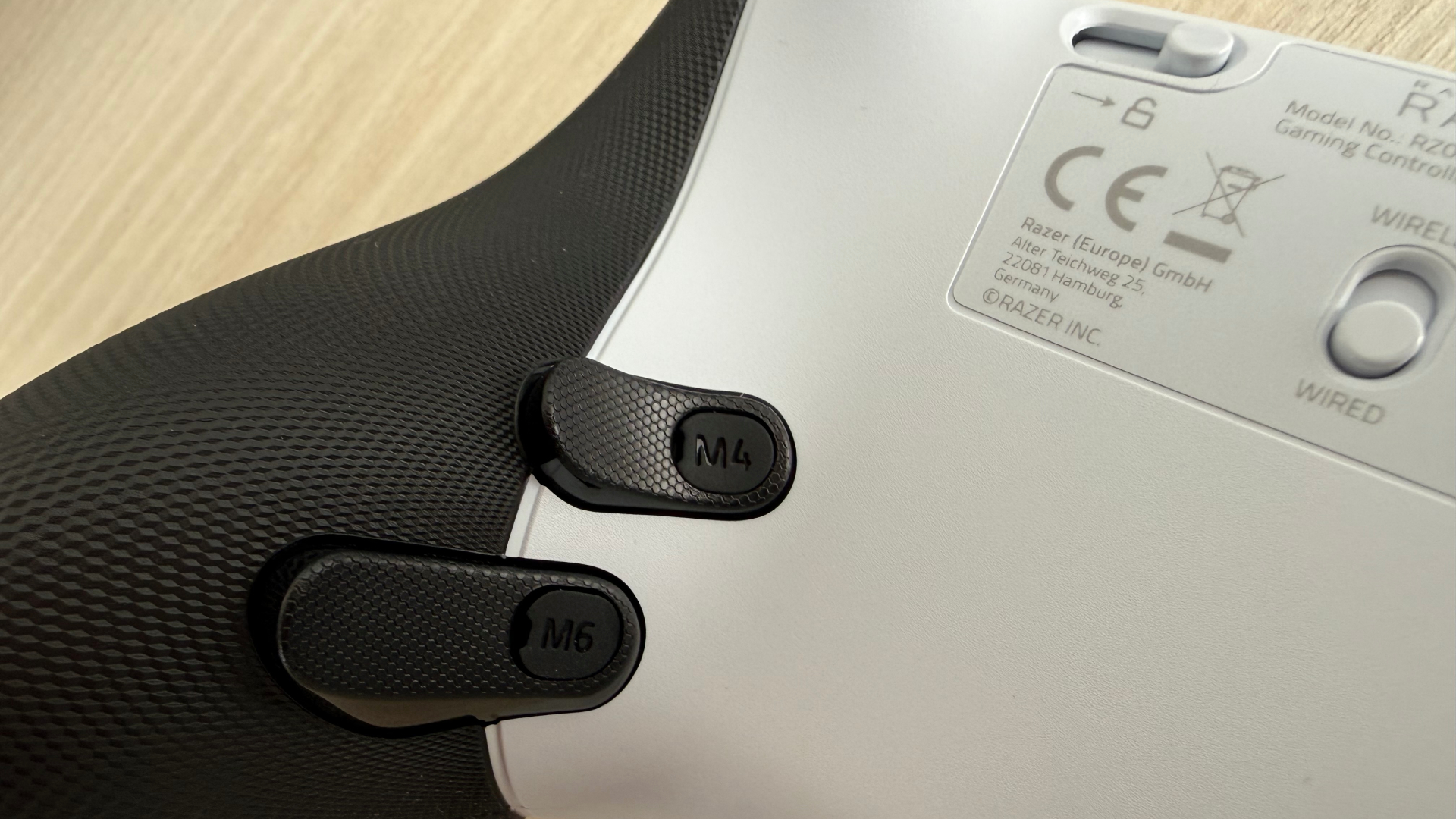 Au-delà de ces améliorations de confort, la vraie raison pour laquelle on investit dans ce type de périphérique, ce sont les boutons supplémentaires. Sur ce point, la Raiju V3 Pro a de bons arguments. Le constructeur a intégré deux mini-gâchettes intermédiaires (M1 et M2) qui viennent s’emboîter astucieusement entre les gâchettes classiques R1/R2 et L1/L2. En retournant la manette, on découvre également quatre palettes arrière (M3, M4, M5 et M6), réparties à raison de deux de chaque côté, qui tombent très naturellement sous les doigts.