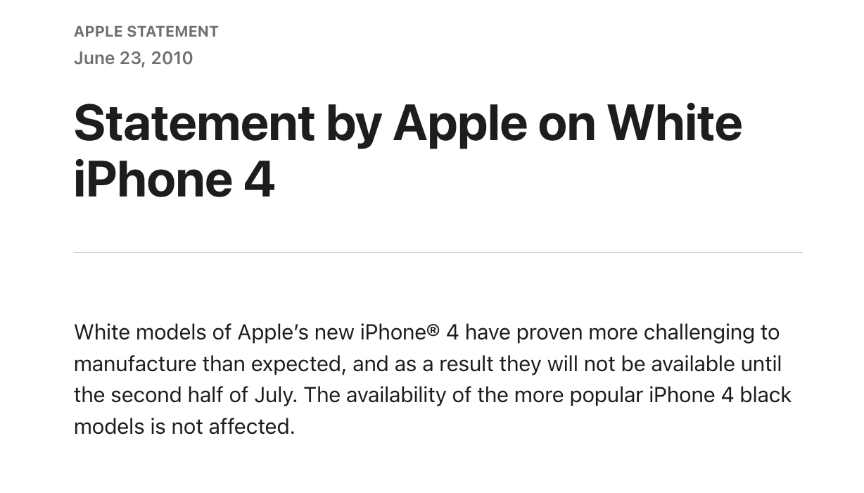 À l’ouverture des précommandes, les clients d’Apple s’étaient d’abord étonnés de ne pas pouvoir acheter l’iPhone 4 blanc. Apple explique le 16 juin que les précommandes ont battu tous les records sans dire pourquoi l’iPhone 4 blanc n’était pas proposé. Le 23 juin, la marque publie un très court paragraphe avec une première déclaration officielle : « La fabrication des modèles blancs du nouvel iPhone 4 d’Apple s’est avérée plus complexe que prévu ; ils ne seront donc pas disponibles avant la deuxième quinzaine de juillet. La disponibilité des modèles noirs de l’iPhone 4, plus populaires, n’est pas affectée. »
