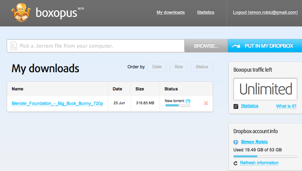Il ne reste alors plus qu’à uploader le fichier torrent pour que le téléchargement se lance. Boxopus permet même de suivre son avancement et d’avoir des informations pratiques sur la taille du fichier ou l’espace restant sur son compte Dropbox.