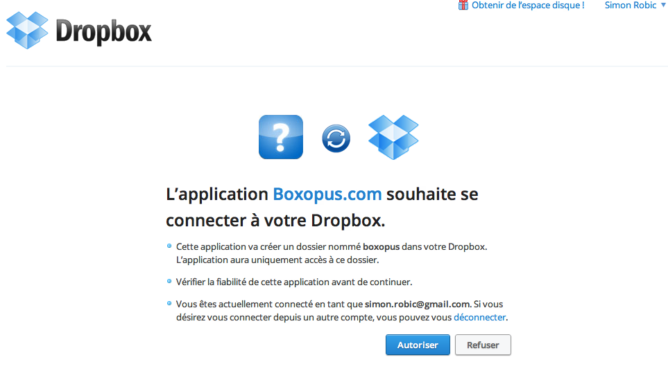Boxopus n’a pas accès au contenu de l’ensemble du compte Dropbox. Il se contente de créer un dossier spécifique et d’y déposer les fichiers téléchargés au nom de l’utilisateur.