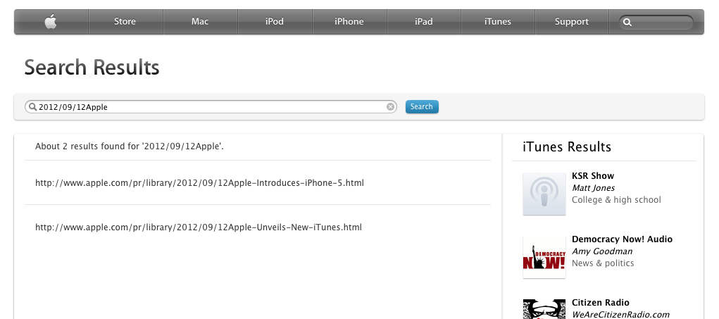 En effet, par exemple sur la requête 2012/09/12Apple, son moteur de recherche affiche deux liens pointant vers des pages inexistantes mais dont les titres sont très parlants.