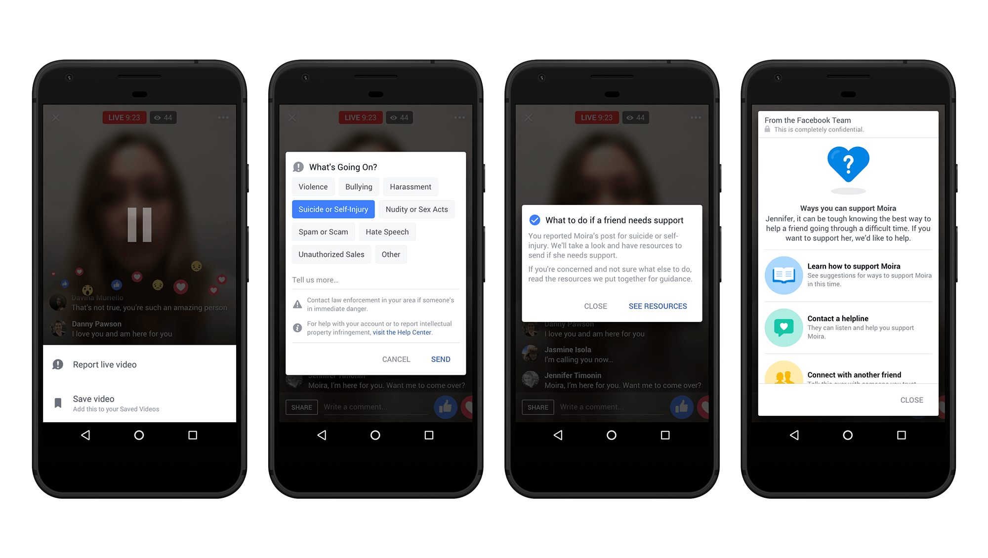 Facebook s’engage aussi pour les utilisateurs de sa plateforme vidéo en direct, Facebook Live. Maintenant, lorsque quelqu’un partage, grâce à l’option dédiée, son « inquiétude » au sujet du diffuseur de la vidéo, Facebook lui demande comment aider ce dernier et transmet l’information à son équipe dédiée pour un examen rapide.