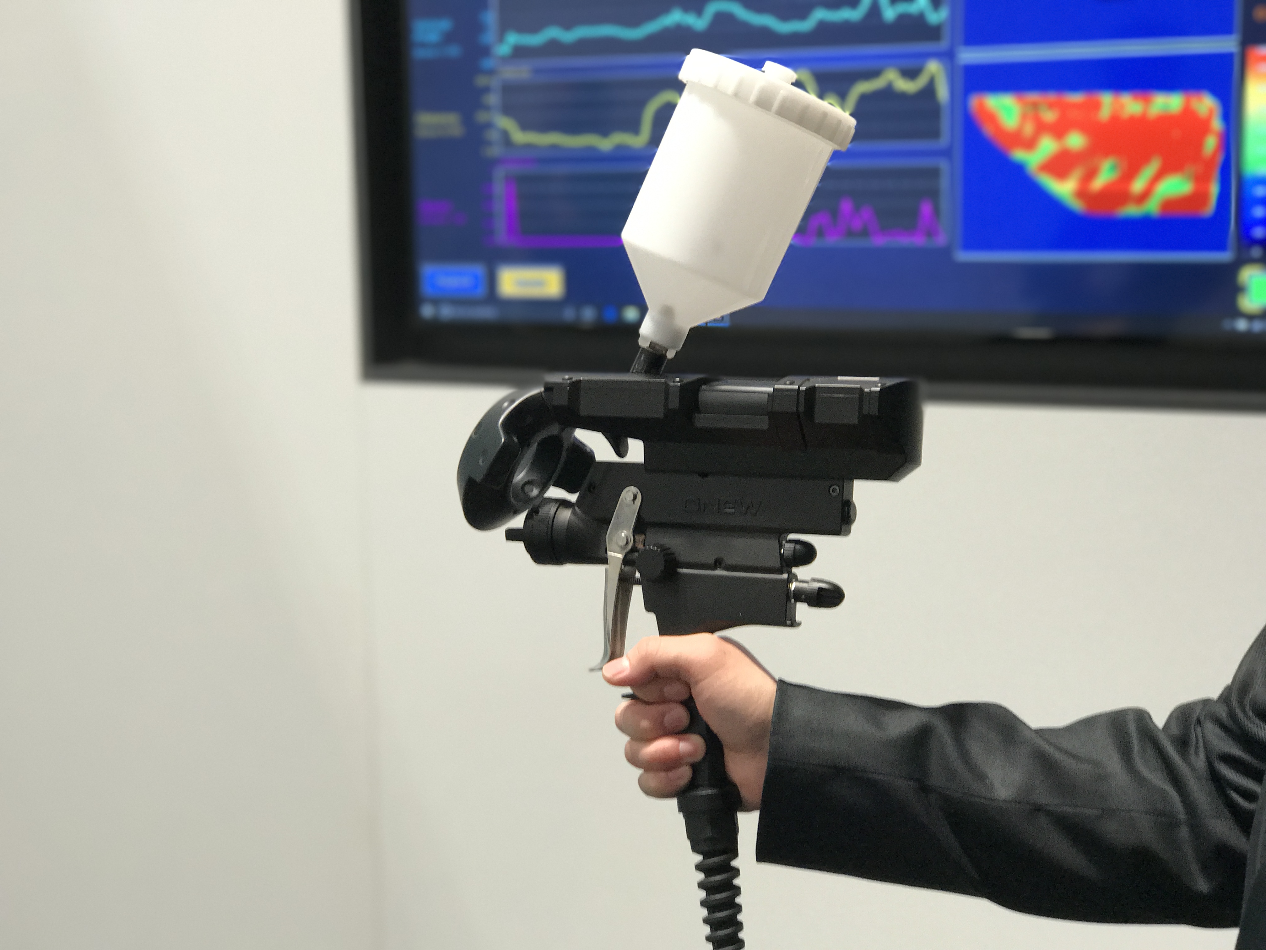 Aujourd’hui, grâce à Vive Tracker, les possibilités de la VR éclatent. Vous pouvez utiliser vos pieds pour frapper des dinosaures. Vous pouvez vous former à la peinture de carrosserie dans une simulation ultra-précise qui va économiser des hectolitres de peinture réelles aux étudiants du secteur. Vous pouvez tenir un vrai flingue imprimé en 3D pour jouer à un shooter. Vous pouvez bénéficier d’un bandeau bien plus confortable, inspiré de celui du PS VR, qui se referme en coulissant. Vous pouvez vous débarrasser du câble de votre Vive et vivre une expérience sans fil. Vous pouvez enfin utiliser un ordinateur portable pour faire tourner les logiciels en réalité virtuelle.
