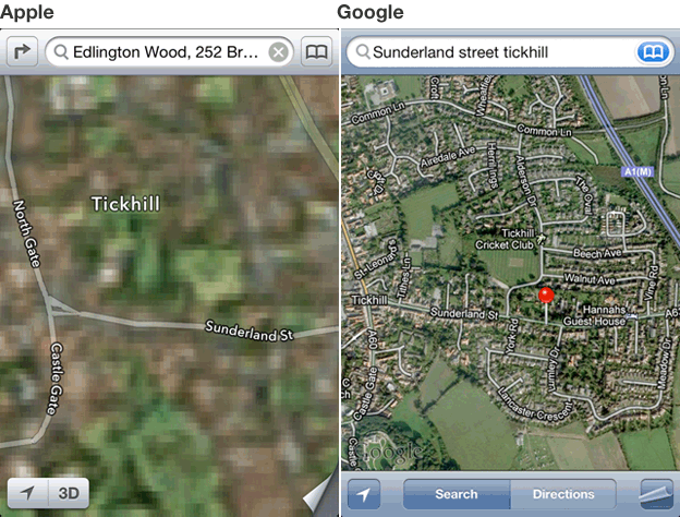 La BBC propose à ce sujet une petite galerie comparative dans laquelle elle oppose la cartographie d'Apple à celle fournie par Google. Sur les quatre exemples, difficile de ne pas donner l'avantage à la firme de Mountain View. Les images sont plus nettes, plus détaillées et offrent des informations plus précises que les informations délivrées par le géant de Cupertino.