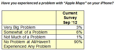 À la question "avez-vous constaté un problème avec Apple Maps sur votre iPhone ?", ils sont une très grande majorité à répondre non. 90 % des sondés ont déclaré n'avoir constaté aucun problème, tandis que 1 % a indiqué qu'une situation survenue avec iOS 6 Maps n'était pas un problème. Seule une minorité, 9 %, affirme avoir rencontré un souci avec le logiciel proposé par Apple.