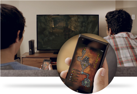 Ainsi par exemple, en l’ayant avec soi sur le canapé, la tablette offrira des informations supplémentaires voire des applications interactives correspondant aux programmes regardés à la télévision. Le téléphone pourra aussi être utilisé en lien avec des jeux sur la Xbox 360, à l’image de ce que propose Nintendo sur sa nouvelle Wii U (par exemple, dans un jeu de rôle, le téléphone pourra permettre de consulter la carte ou l’inventaire).