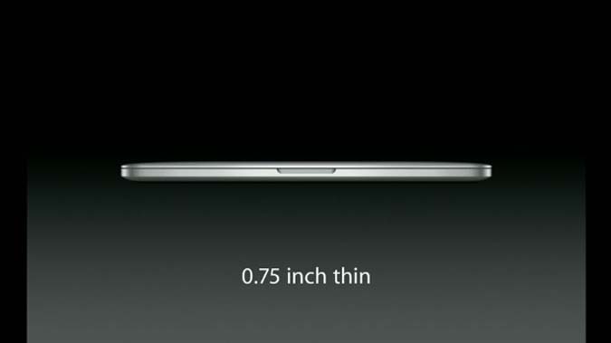 19h17 : De nouveaux ordinateurs portables Mac arrivent. Le MacBook Pro 13 pouces supporte désormais l'affichage Retina, est plus léger (1,58 Kg) et plus fin (1,9 centimètre) de 20 %.