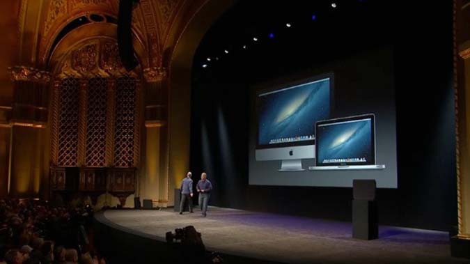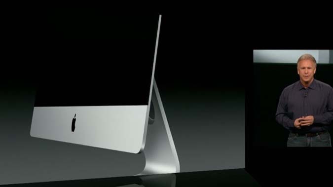 19h27 : un nouvel iMac est présenté. Il est plus fin que le modèle précédent (5 mm d'épaisseur). Deux tailles proposées, 21 et 27 pouces. L'écran est présenté comme moins sensible aux reflets (75 % en moins). Une caméra FaceTime en haute définition, deux micros et deux enceintes complètent l'appareil.