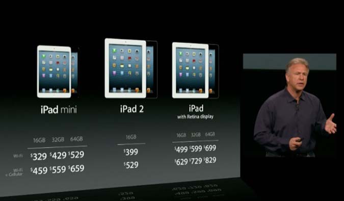 19h57 : une diagonale d'écran de 7,9 pouces pour l'iPad Mini, contre 9,7 pouces pour l'iPad. 7,2 mm d'épaisseur, pesant 308 grammes (53 % plus léger que l'iPad).