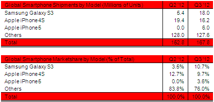 Ainsi, Samsung a livré 18 millions de Galaxy S3 au troisième trimestre, contre 16,2 millions d'iPhone 4S vendus par Apple. En terme de parts de marché, le Samsung Galaxy S3 conquiert 10.7 % des ventes, contre 9,7 % pour l'iPhone 4S.