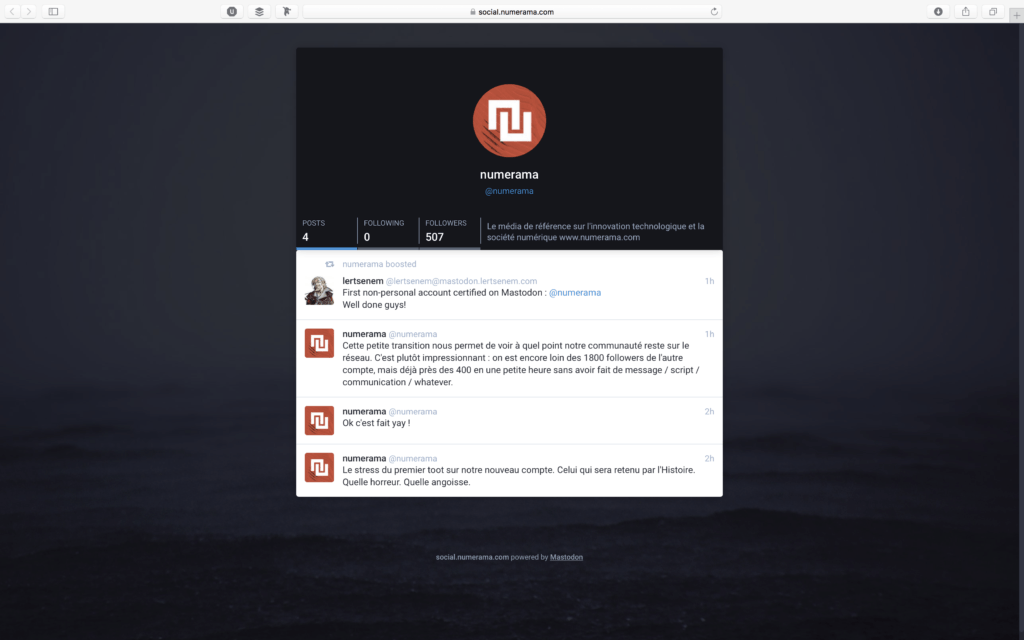 Cette diversité des profils est la première raison qui nous a conduit à croire que l’on pouvait accorder de l’importance à Mastodon. Numerama fait partie du groupe média indépendant Humanoid.fr : nous sommes une PME et toutes les ressources que nous allouons à des projets annexes sont mesurées — impossible de gâcher du temps de travail pour un effet de mode. Nous savons aussi que Mastodon ne sera pas le nouveau Twitter et qu’il n’atteindra peut-être jamais une masse d’utilisateurs aussi conséquente que le réseau social à l’oiseau. Mais cet espace naissant est séduisant, autant par sa liberté que par ses idéaux.