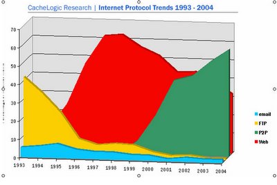 Cette puissance de la coopération des individus qui s’organisent en réseau est démontrée par ce graphique issu d’une recherche de CacheLogic qui démontre que le trafic P2P est passé rien à 60% du traffic total de l’Internet en 2004 en quelques années.