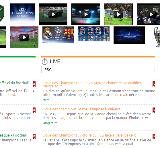 Chaque colonne peut ensuite faire l'objet d'une recherche complémentaire. Si l'on entre "PSG" dans la colonne "live", seules les actualités qui parlent de l'équipe du Paris Saint Germain dans la Ligue des Champions restent affichés. Pratique :