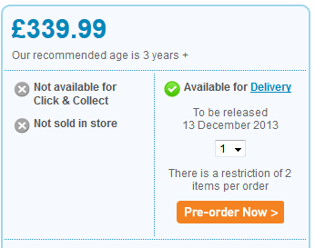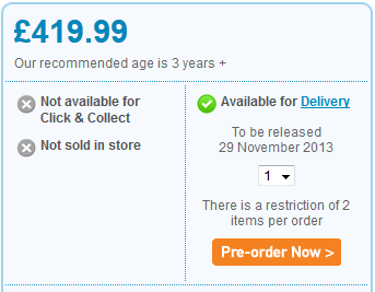 La date affichée par Toys “R” Us concorde avec les informations fournies par Microsoft lors de sa conférence, mais son exactitude est à considérer avec précaution. Concernant Sony, une date aussi tardive – une dizaine de jours avant Noël – laisse entendre que le groupe nippon compte être présent avec la PS4 sur les principaux marchés avant les fêtes de fin d'année.