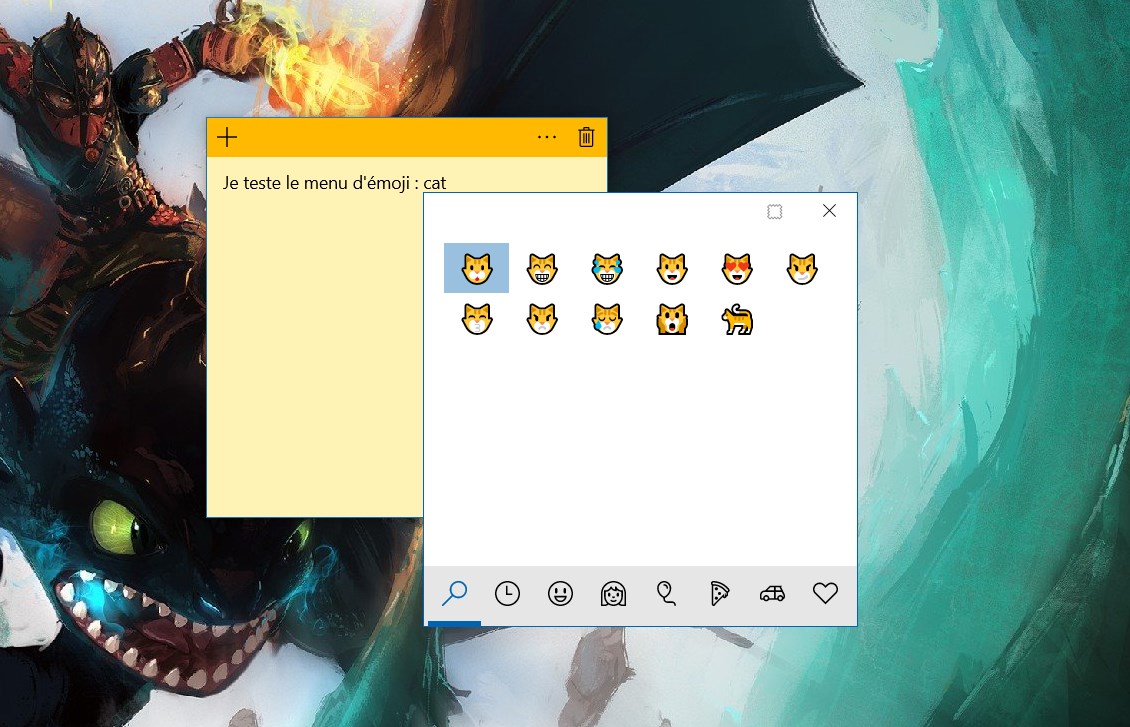 Si sur smartphone et tablette il est très simple d’ajouter des émojis grâce à un onglet dédié dans la plupart des claviers virtuels, ce n’est pas aussi facile sur ordinateur avec un clavier physique. Microsoft propose sa solution avec le panneau d’émoji, seulement disponible sur le clavier américain pour le moment, que l’on peut appeler avec le raccourci « Win + . » ou « Win + ; ». Il permet facilement sélectionner un émoji, ou d’en rechercher un en continuant de taper du texte (taper « cat » et vous aurez le choix par mis les nombreuses images de chats). Comme sur iOS, en somme.