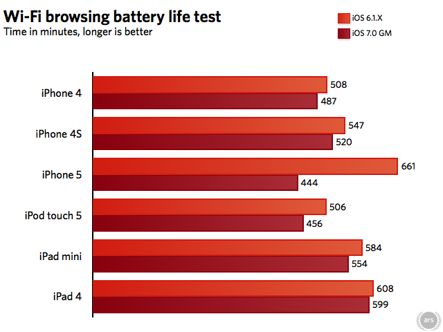 Certes, l'effet d'iOS 7 varie selon le produit. La perte est relativement limitée avec l'iPad 4 (9 minutes en moins), l'iPhone 4 (21 minutes), l'iPhone 4S (27 minutes) ou l'iPad Mini (30 minutes). En revanche, elle atteint 50 minutes avec l'iPod Touch 5 et plus de 3 heures pour l'iPhone 5 ! Ars Technica explique avoir constaté ces écarts en effectuant une navigation sur le web, via l'accès WiFi.
