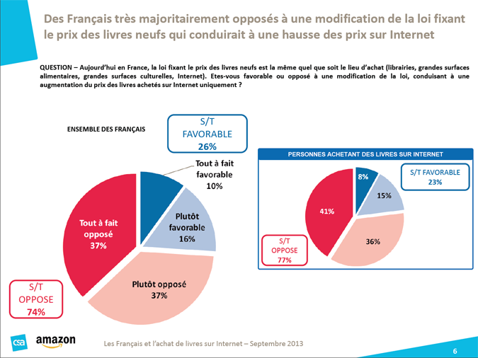 Le mois dernier, Amazon a commandé à l'institut CSA un sondage exclusif, qui n'avait pas été publié jusqu'à cette semaine. Réalisé les 10 et 11 septembre 2013 auprès de 1011 personnes résidant en France âgées de 18 ans et plus, il montre que 90 % des Français interrogés sont favorables au maintien de la gratuité des frais de livraison pour les livres commandés sur Internet (93 % chez ceux qui justement, achètent en ligne), ce qui est favorable au marchand américain.