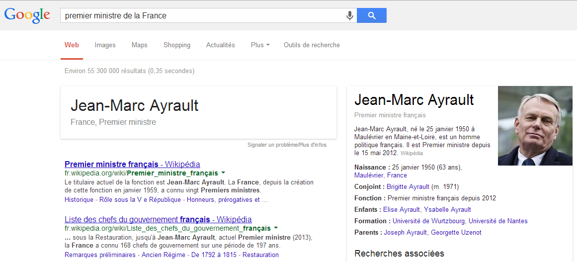 Par exemple, si vous dites "OK Google – Premier ministre de la France", une voix féminine prononcera "Jean-Marc Ayrault". Si vous recherchez le "Produit Intérieur Brut de la France", la voix ne saura pas communiquer directement le chiffre, mais dira "Voici quelques informations sur France", avec le graphique correspondant.