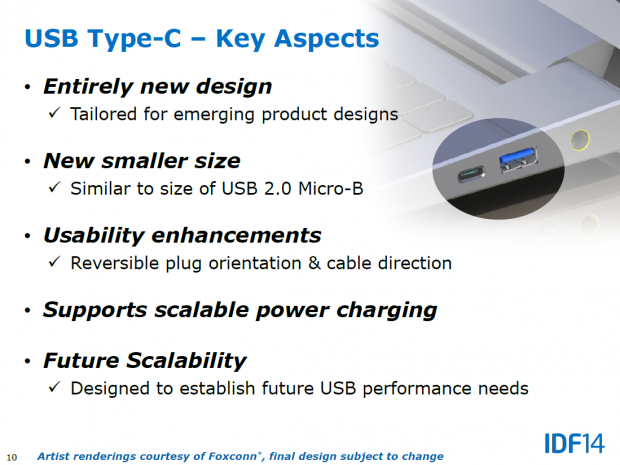 Alors que le développement de l'USB 3.1 "Type C" se poursuit, une présentation a fuité en ligne avec quelques illustrations montrant le futur aspect de la prise. Si ce document précise que "le design final est susceptible de changer", ces premières images donnent une idée de l'aspect définitif de la prise vers lequel l'USB Implementers Forum compte tendre.