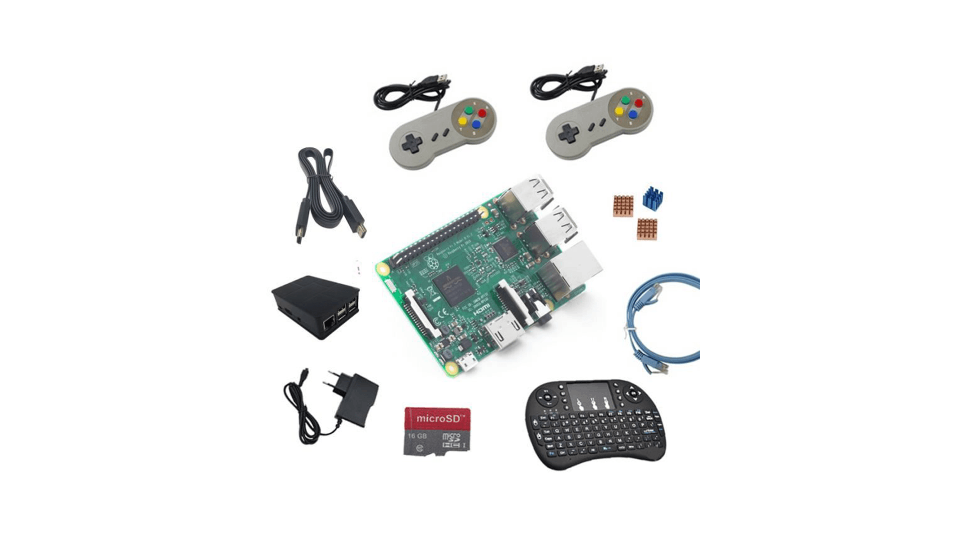 Le Raspberry Pi 3 Model B est équipé d’un ARM Cortex-A53 quad-core cadencé à 1,2 GHz, 1 Go de RAM, d’un GPU dual-core et du WiFi / Bluetooth. Ce pack comprend des manettes + un adaptateur + une carte microSD de 16 Go + un dissipateur de chaleur + un clavier + un câble HDMI + un câble réseau. Soit tout ce qu’il faut pour vous lancer dans l’aventure.