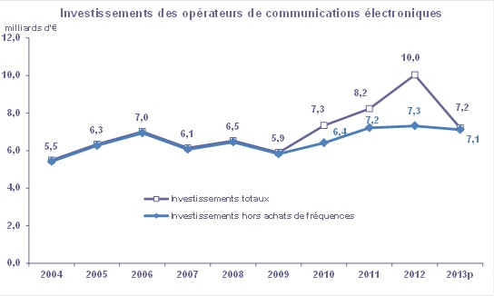 Sur ce total, le gendarme des télécoms indique "l'activité mobile représente environ le tiers des flux d’investissements des opérateurs" tandis que "la partie de ces investissements réalisés dans le haut et très haut débit mobile (3G et 4G) est estimé à environ 1,7 milliard d’euros en 2013" Si l'on ajoute l'achat des fréquences, l'investissement des opérateurs grimpe jusqu'à un total de 10 milliards d'euros.
