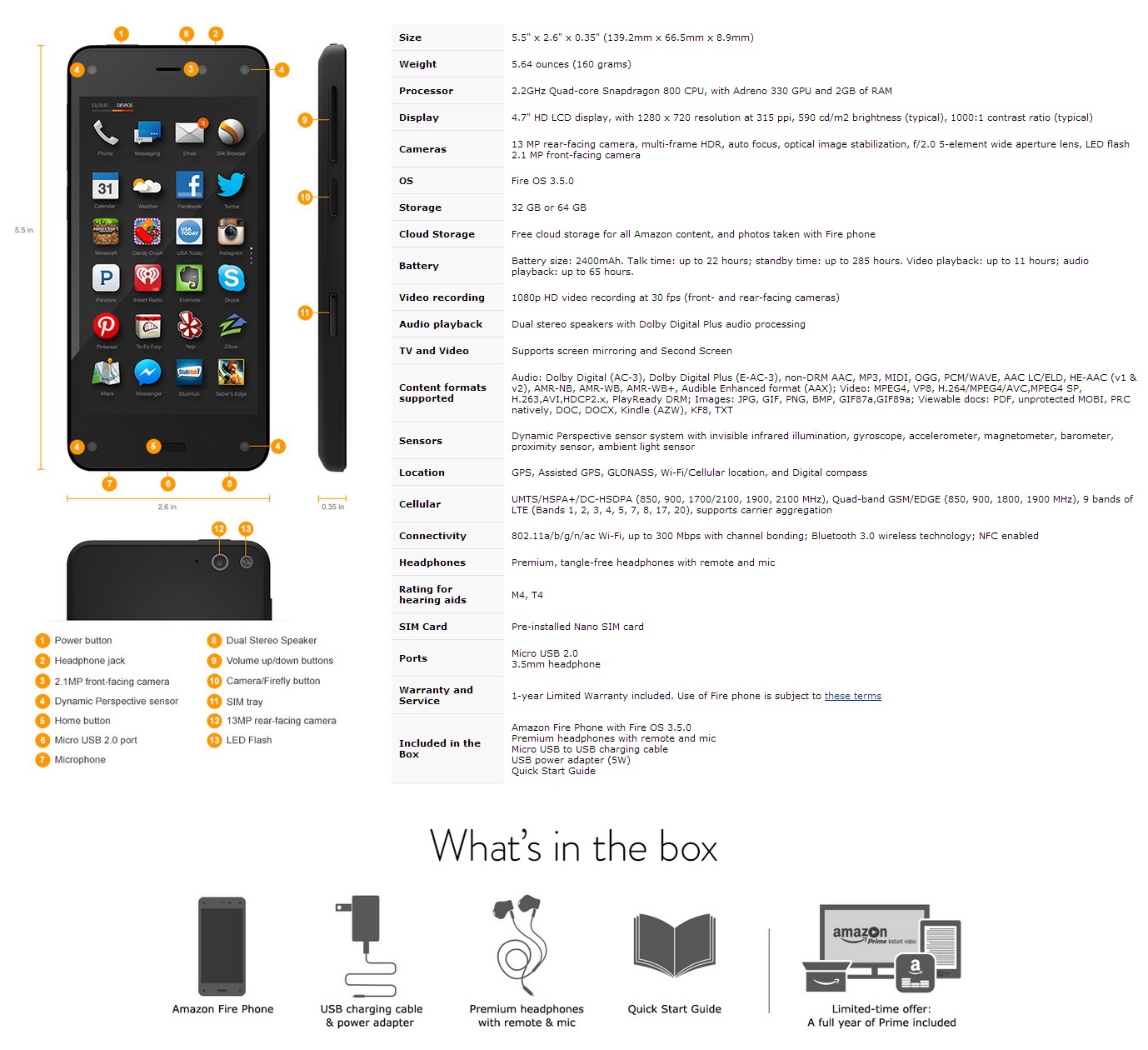 Équipé d'un processeur quadricœur cadencé à 2,2 GHz, d'un processeur graphique Adreno 330, d'une mémoire vive de 2 Go, d'un espace de stockage de 32 ou 64 Go et d'un objectif photo de 13 mégapixels, le Fire Phone dispose d'un écran d'une diagonale de 4,7 pouces et s'appuie sur une version modifiée du système d'exploitation Android (baptisée pour l'occasion Fire OS).