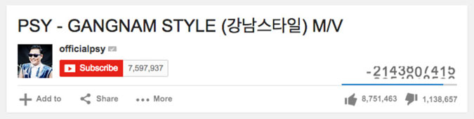 Mais l'engouement planétaire autour de Gangnam Style a quelque peu bouleversé la donne. YouTube a donc opté pour un type d'entier de 64 bits qui devrait a priori régler définitivement un nouveau bug dans l'affichage du compteur de vues. En effet, l'intervalle d'un entier de 64 bits en informatique va de -9 223 372 036 854 775 808 à 9 223 372 036 854 775 807 (plus de 9 milliards de milliards).