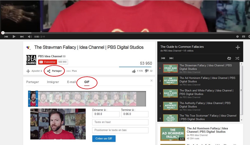 Lorsque vous affichez une vidéo sur YouTube, vous devez cliquer sur l’onglet « Partager », puis la sous-rubrique « GIF ». Un ruban s’affichera alors, présentant tout le déroulé de la vidéo. Il suffit à ce moment de se positionner à l’endroit voulu, de définir la durée du GIF (six secondes au maximum) et d’ajouter ensuite un un texte (optionnel) dans les deux champs prévus à cet effet.