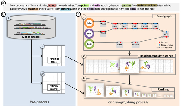 Ensuite, un animateur lit le scénario de base qui décrit sommairement la scène de combat souhaitée par le réalisateur, et le traduit dans un langage syntaxique qui permet de fouiller automatiquement dans la base de données pour retrouver les scènes qui pourraient être utilisées. Une multitude de scènes candidates sont alors triées, en grande partie par algorithmes mais aussi avec une sélection finale par les animateurs, pour assurer une diversité entre les films et une cohérence d’ensemble au combat filmé. Les scènes sont ensuite mises bout à bout, avec des mécanismes qui assurent une transition souple entre chaque séquence :