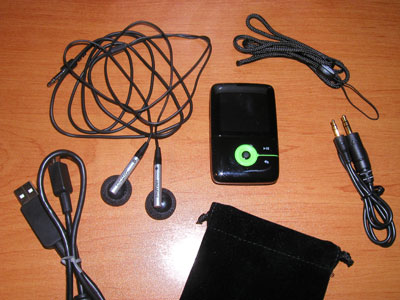 Accessoires : Le baladeur est fourni avec écouteurs, câble de connexion USB 2.0, dragonne, étui de rangement en tissu et Creative a même pensé au câble d’entrée-ligne jack 3.5 pour l’enregistrement. Malheureusement, le fabricant ne fournit pas de chargeur (sauf en option) puisque le seul chargement possible de la batterie interne s’effectue via la prise USB. Ce détail témoigne déjà d’une volonté de Creative de destiner le baladeur au bureau plus qu’au voyage, comme nous le verrons dans le test. Les écouteurs par ailleurs gagneront à être remplacés tant ils perdent en graves et saturent dans les aigus. Enfin on appréciera la qualité de l’étui avec ses cordelettes de fermeture, mais son utilité nous a semblé limitée.