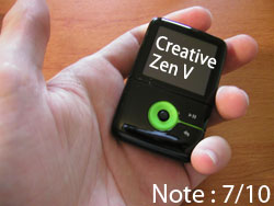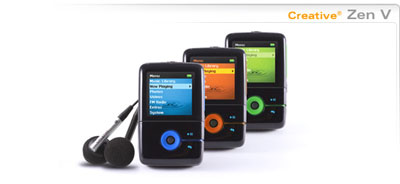 Caractéristiques techniques : Le Zen V est un baladeur très compact (67 x 43 x 15 mm), et particulièrement léger avec uniquement 43,5 g, batterie comprise. Il est disponible en versions 1 Go ou 2 Go, voire 4 Go sur le Zen V Plus, et supporte les formats audio MP3 et WMA (jusqu’à 320 Kbits/s) avec ou sans DRM, et le WAV (PCM et IMA ADPCM). Son écran OLED 128 x 128 pixels (262 000 couleurs) de 37 mm de diagonale permet l’affichages d’images au format JPEG. Le Creative Zen V possède une fonction dictaphone grâce à son micro intégré, qui enregistre en IMA ADPCM (8 kHz, mono), ainsi qu’une fonction d’enregistrement en entrée de ligne en WMA (128 Kbits/s et 160 Kbits/s). Il se connecte à l’ordinateur en USB 2.0, avec le protocole MTP.
