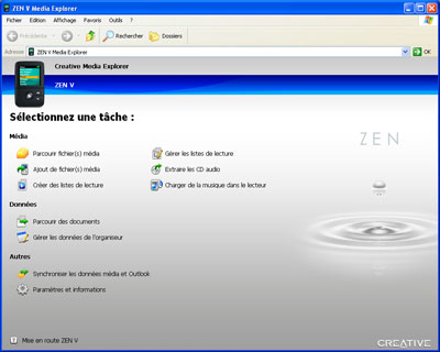 Notez que l’utilisation du protocole MTP permet à Windows Vista de gérer parfaitement le baladeur sans l’installation du moindre pilote. En revanche, il sera plus pénible d’utiliser le Zen V sous Linux ou sur un Macintosh, puisque rares sont les solutions actuelles sur ces systèmes pour gérer le protocole mis au point par Microsoft.