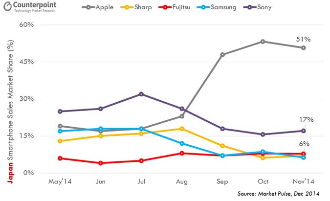 Le marché japonais comporte toutefois une exception : Apple. Non seulement il s'agit firme occidentale (alors que toutes les autres sont asiatiques, et presque toutes japonaises), mais en plus sa part de marché est très largement au-dessus des autres : toujours selon Market Pulse, celle-ci s'est établie à 51 % au mois de novembre 2014. D'ailleurs, le succès d'Apple coïncide avec le lancement de l'iPhone 6.