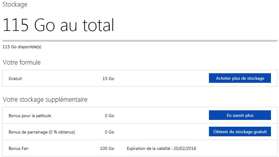 Une fois cette étape terminée, l'espace de stockage disponible sur OneDrive sera alors de 115 Go : 15 Go provenant de la formule gratuite et 100 Go résultant de l'offre gratuite. Mais attention : il ne s'agit pas d'un acquis définitif. En réalité, cette promotion n'est valable qu'un an à compter du jour de l'inscription. Si elle a été activée le 20 février 2015, elle prendra donc fin le 20 février 2016.