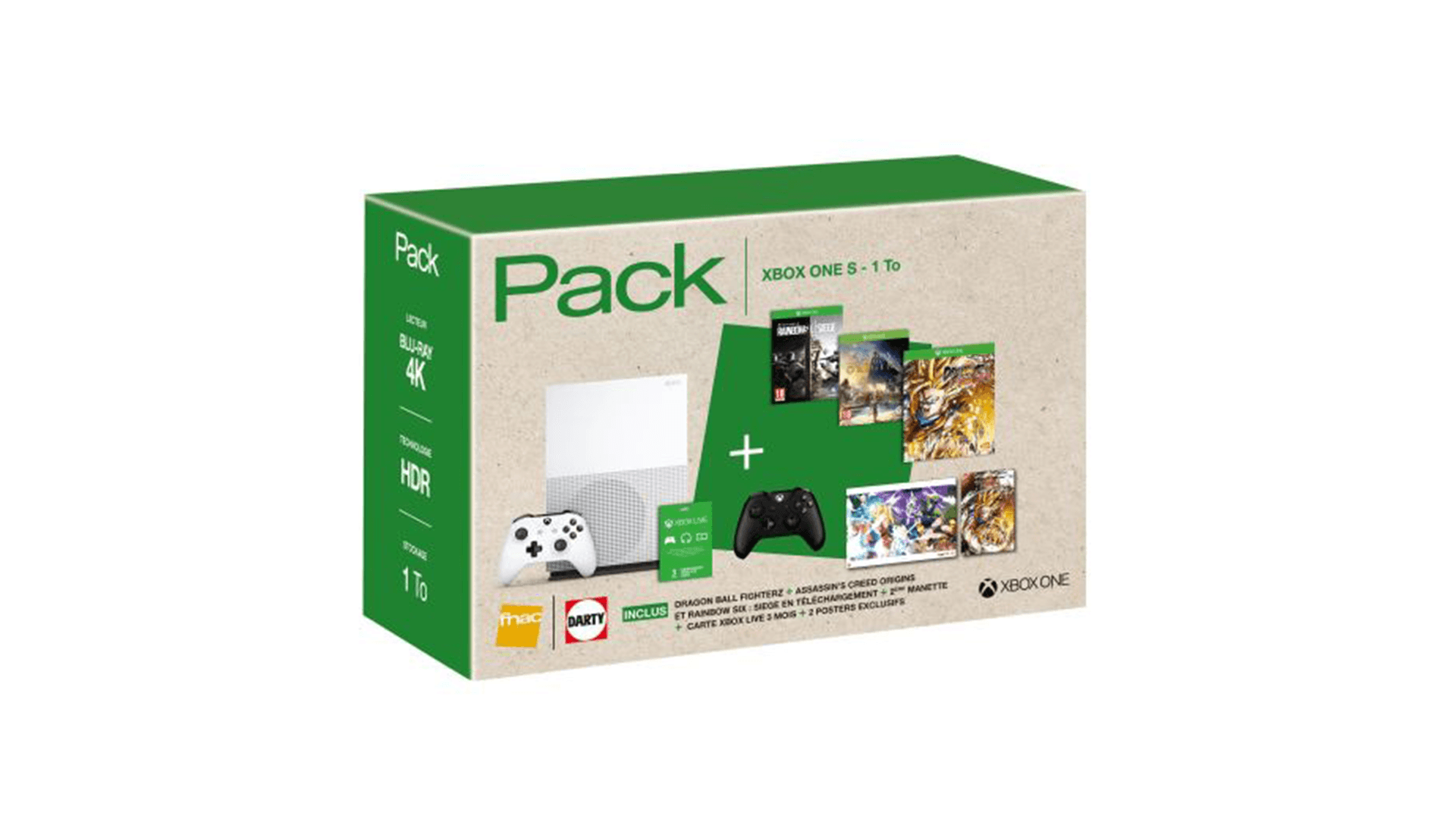 Elle est proposée sur Fnac.com avec les jeux Assassin’s Creed Origins et Rainbow Six : Siège en téléchargement, le jeu Dragon Ball Fighter Z, une deuxième manette sans fil, un câble HDMI, 14 jours Xbox Live Gold, un pass d’un mois Xbox Game et une carte Xbox Live de 3 mois.