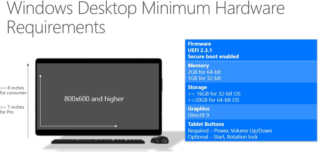 Pour les terminaux dont la diagonale mesure entre 3 et 7,99 pouces, c'est-à-dire des petits smartphones aux tablettes, on apprend que la mémoire vive devra atteindre 512 Mo pour les appareils utilisant une architecture 32 bits et que l'espace de stockage devra être au minimum de 4 Go. Microsoft souligne par ailleurs que la mémoire vive requise dépendra de la définition de l'image.