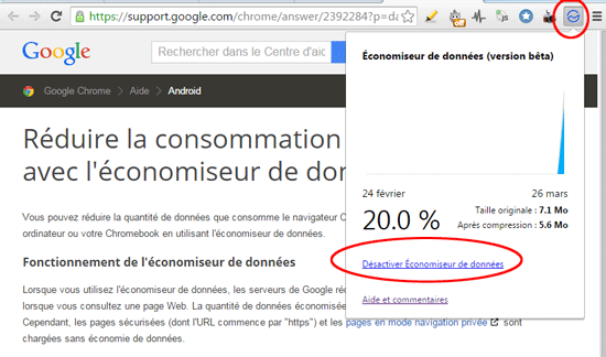 Toutefois parce qu'il agit de fait comme un proxy qui masque l'adresse IP réelle de l'utilisateur, l'extension Data Saver peut aussi poser des problèmes sur des services qui nécessitent la géolocalisation de l'adresse IP, ou sur les serveurs intranet. Il est bien sûr de désactiver l'extension d'un simple clic :