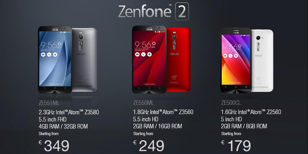 Le premier modèle (ZE500CL) est le plus abordable. Pour 179 euros, le mobile inclut un processeur double-cœur Intel Atom Z2560 cadencé à 1,6 GHz, un écran HD (720p) d'une diagonale de 5 pouces, 2 Go de mémoire vive et 8 Go d'espace de stockage. On y trouve aussi le Wi-Fi 802.11n, deux objectifs (8 Mpix à l'arrière et 2 Mpix à l'avant) une compatibilité avec les réseaux 4G (100 Mbit/s) et une batterie de 2500 mAh.