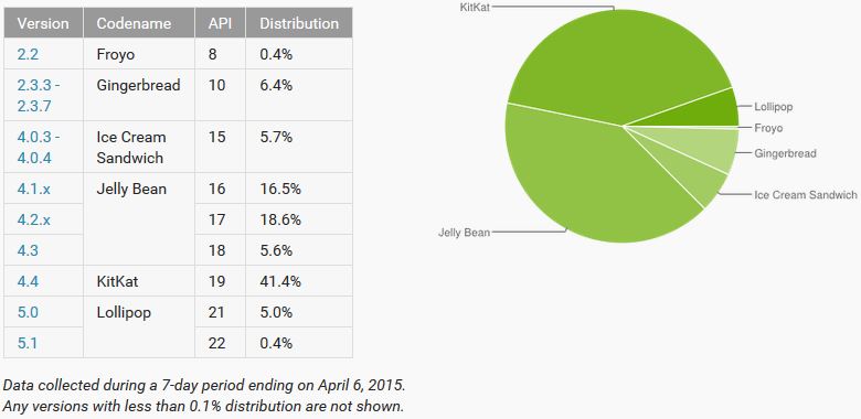 L'adoption de Lollipop suit son cours. Les dernières statistiques communiquées par Google concernant la dernière branche (5.x) de son système d'exploitation mobile montrent que cette version figure sur 5,4 % des terminaux qui ont été aperçus sur Google Play entre le 27 mars et le 6 avril 2015.