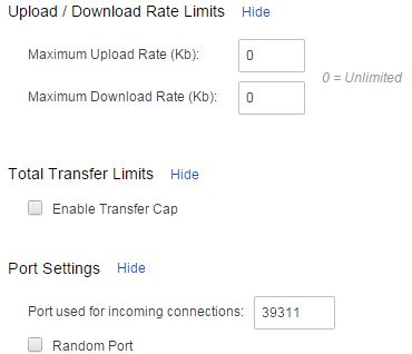 Les trois dernières options permettent de renseigner le port à utiliser pour les connexions entrantes (celui-ci peut être choisi aléatoirement à chaque démarrage du logiciel), de régler un serveur proxy lors des téléchargements et d'envoyer des informations anonymes à BitTorrent Inc en cas de crash du logiciel, afin de lui permettre d'améliorer sa stabilité.