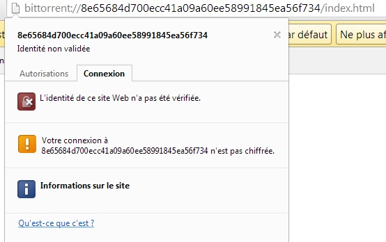 Au lieu de débuter par http://, elle se compose en effet d'un préfixe bittorrent:// suivi d'une partie pointant vers la ressource demandée : 8e65684d700ecc41a09a60ee58991845ea56f734/index.html pointe par exemple vers la page d'accueil du projet Maelstrom. Et pour le coup, on ne peut pas dire que ce type d'adresse soit facile à mémoriser ; il faudra beaucoup utiliser les favoris en attendant système plus lisible.