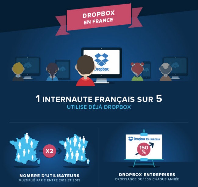 D'ailleurs, une infographie publiée par la société américaine, et reprise par l'Usine Digitale, affirme qu'un internaute français sur cinq utilise Dropbox (ce qui représente environ 10 millions de personnes, si l'on se base sur les projections d'eMarketer pour 2015) et que le nombre d'usagers a été multiplié par 2 entre 2013 et 2015. Du coup, on comprend mieux pourquoi la France s'intéresse autant aux données de l'entreprise.