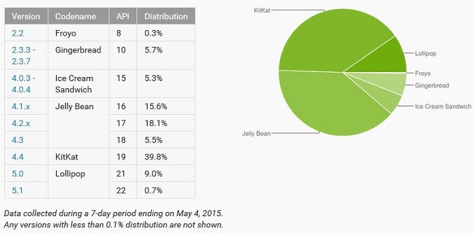 Alors qu'elle ne figurait que sur 5,4 % des terminaux aperçus sur Google Play, elle se trouve aujourd'hui sur 9,7 % d'entre eux. De façon mécanique, toutes les autres versions de l'O.S. enregistrent une baisse.