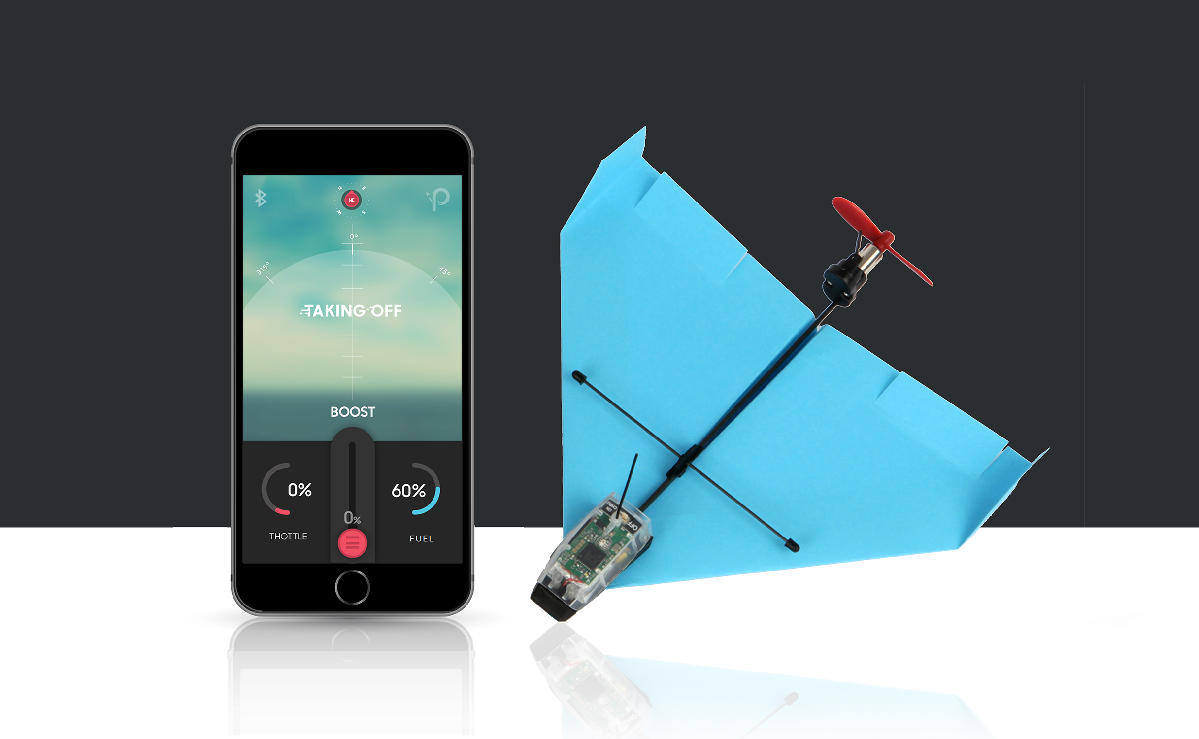 Son module PowerUp Dart permet en effet de convertir un simple avion de papier en sorte de mini drone, télécommandable directement grâce à l’écran et à l’inclinaison d’un téléphone.