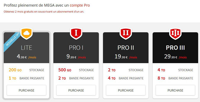 Ces abonnements sont toujours d'actualité, mais Mega a une quatrième offre, qui conviendra davantage aux usagers ayant un budget plus restreint et aux utilisateurs n'ayant pas besoin de plus de place dans l'immédiat. Cette formule, baptisée Mega Lite, est facturée 4,99 euros par mois et donne accès à 200 Go de stockage et 1 To de bande passante.