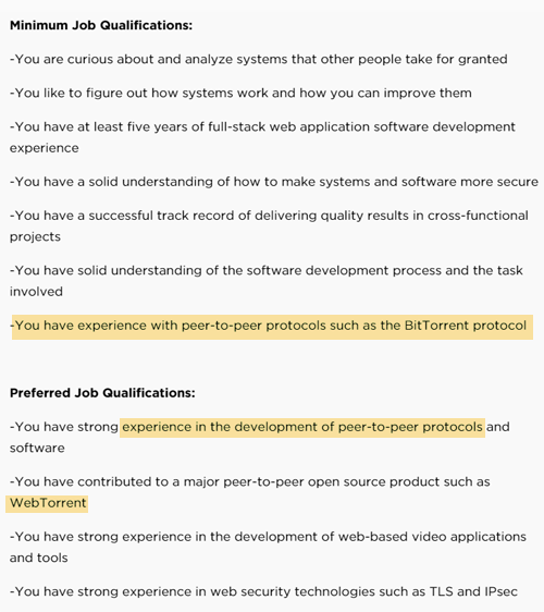Une "grande expérience dans le développement de protocoles et logiciels peer-to-peer" et le fait d'avoir "contribué à un produit peer-to-peer open source majeur tel que WebTorrent" sont aussi des qualités recherchées pour le poste basé à Los Gatos, en Californie.