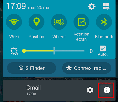Sur un téléphone Samsung Galaxy (en tout cas sur le Samsung Galaxy S5 qui nous sert de test), la manoeuvre est sensiblement la même. Laissez votre doigt sur l'application qui affiche une notification pour accéder à ses paramètres (accessibles aussi par le menu principal de l'appareil), et appuyez sur l'icône "i" :
