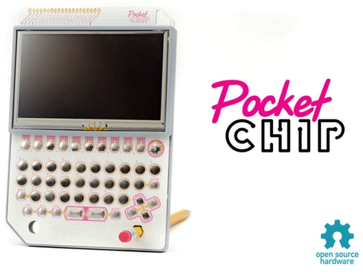 En outre, il est possible de transformer le CHIP en ordinateur/console portable avec le Pocket CHIP, doté d’un écran de 4,3 pouces, d’un clavier QWERTY et d’une batterie capable de l’alimenter pendant 5 heures :