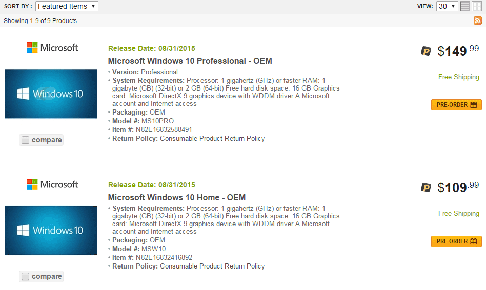 Le distributeur Newegg, qui avait déjà fait fuiter les prix de Windows 8 en 2012, a mis en ligne sur son catalogue les prix de vente des différentes versions de Windows 10, et sa date de sortie. Si l'on en croit le revendeur, Windows 10 serait disponible en version OEM (pour les professionnels qui installent Windows sur les PC ou tablettes qu'ils vendent) à partir du 31 août 2015, ce qui ferait une sortie légèrement plus tardive que ce qui avait été anticipé.